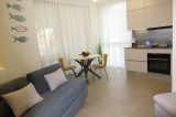 Living-dining room with kitchen and sofa bed with another normal pull-out bed. Kitchen equipped with every appliance: induction hob, oven, microwave, fridge freezer, dishwasher. Balcony + large terrace for outdoor dining. Air conditioning, large double bedroom, garage, floor 1 elevatorNear the Sea
